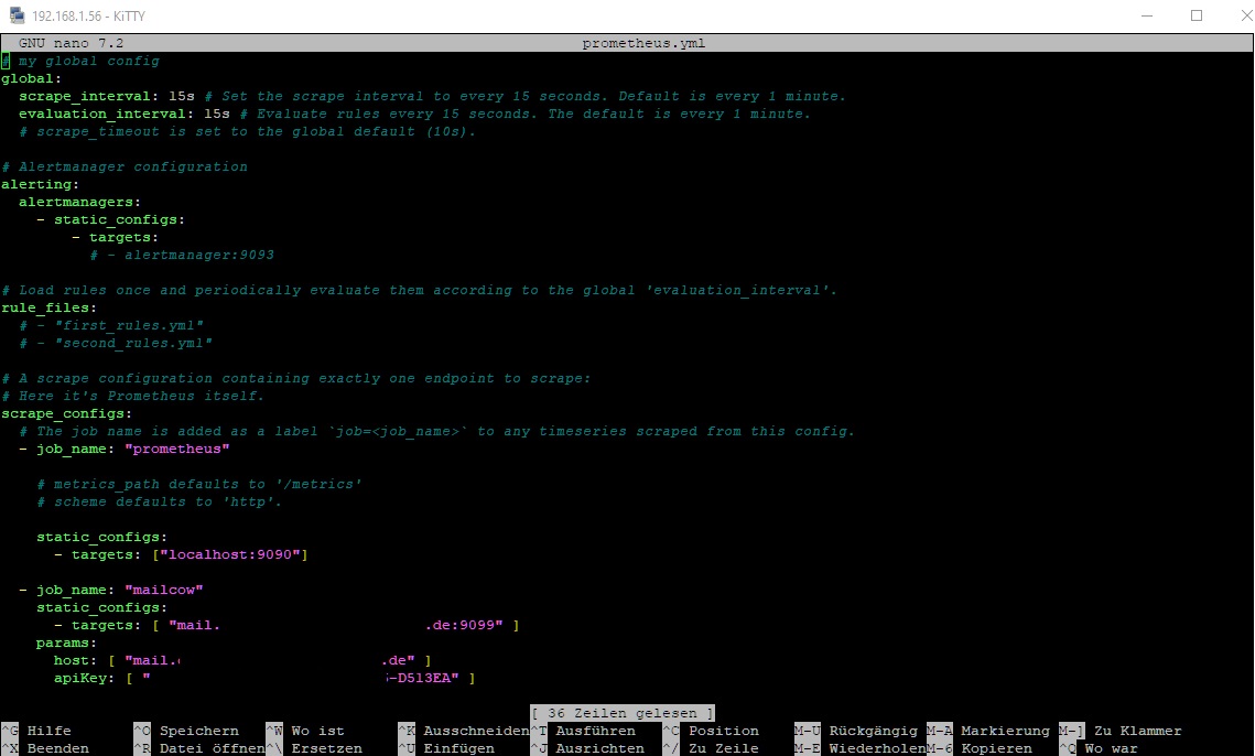 Dort dann die "prometheus.yml" angepasst an die URL inkl. API-Key der Mailcow ( s. 2. Screenshot ):