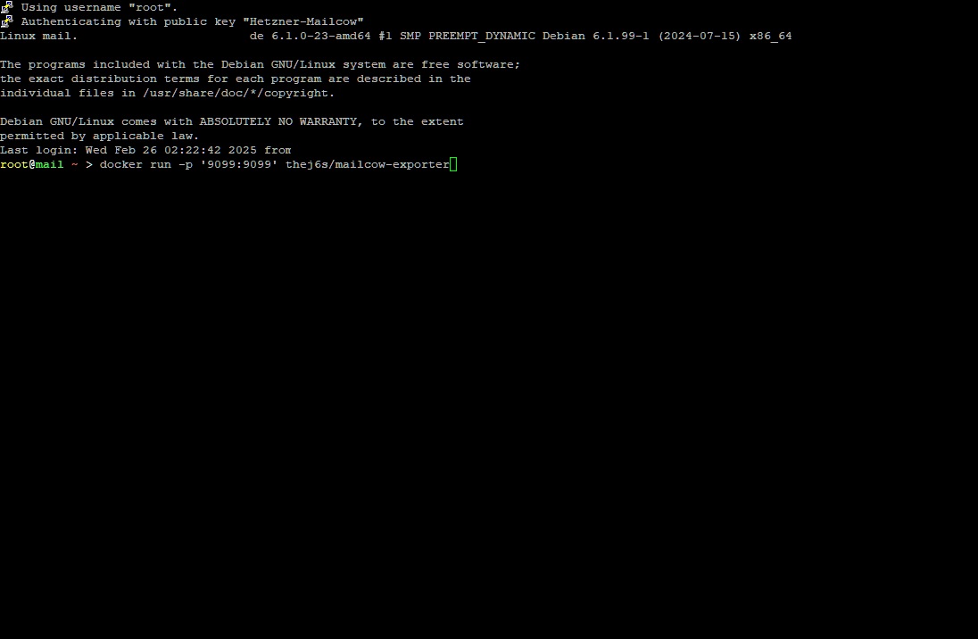 docker run -p '9099:9099' thej6s/mailcow-exporter