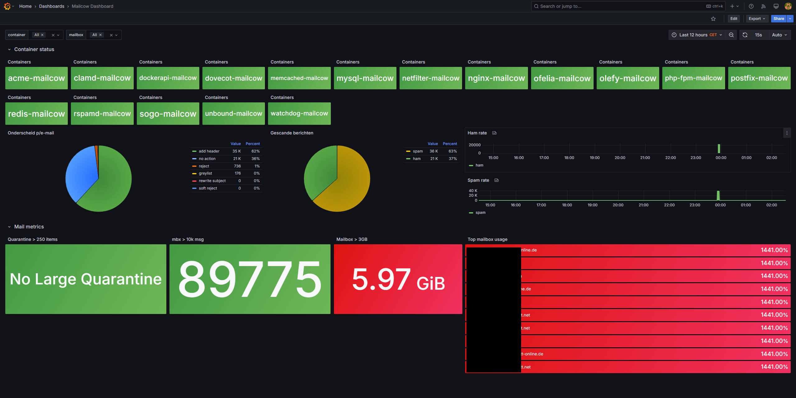 Sobald auf der Mailcow der "thej6s/mailcow-exporter" läuft, werden die Daten schon zum Prometheus geschoben und wir können unser Dashboard im Grafana "basteln" bzw. eher gesagt "klauen". :)